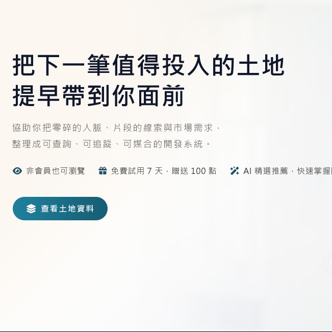 AI 精選推薦會依會員填寫的需求條件與後續使用行為,推薦更符合方向的土地資訊,協助快速縮小篩選範圍。